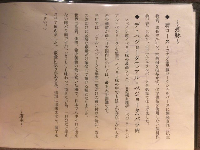 具はチャーシュー2種、味付け玉子、穂先メンマ、三つ葉、ネギ。2種類のチャーシューは蘊蓄によると、低温調理の肩ロースはカナダ産黒豚バークシャーをベースにしたSPFナチュラルポーク、豚バラ肉はイベリコ豚の最高ランクである100%純血種デ・ベジョータを使用という、到底ラーメン屋とは思えないこだわりよう。味はもちろん最高です。