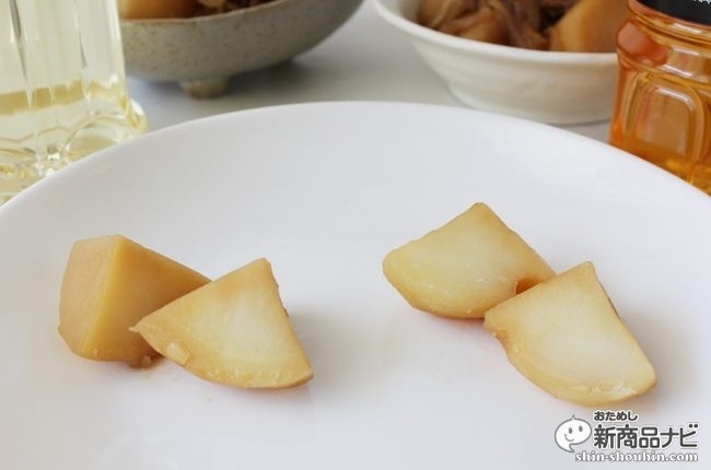 左:一般的な本みりん 右:稲美町産純米本みりん試しにじゃがいもを切ってみても、味の染み込み方も同じようだ。