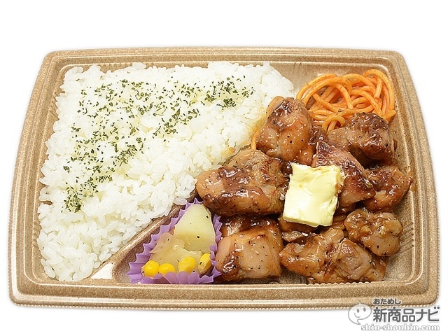 食べ応えのあるガーリックチキン弁当。ガーリック醤油を絡めて焼き上げたグリルチキンに香ばしいバターをのせた、食べ進みのよい味わい。