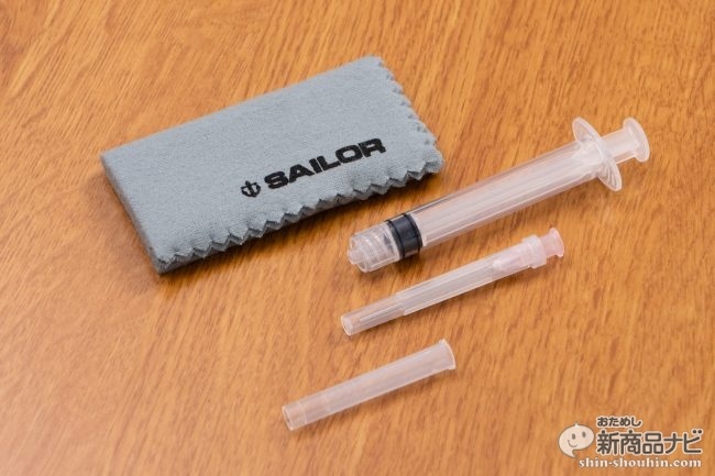 この『万年筆メンテナンスキット』(税込1,080円・発売中)の、セット内容はとてもシンプル。注射器のような「洗浄機(本体)」と筒状の「洗浄ノズル」、注射針のような「インク吸入ノズル」、それに「クリーニングクロス」の」4つである。
