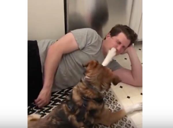ワンちゃんの鉄拳がご主人様の顔面にクリーンヒット!