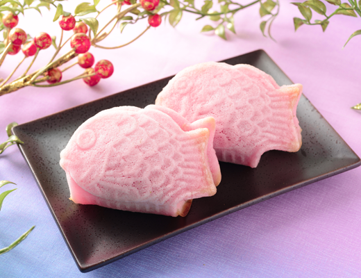 ほんのり苺風味のピンク色の生地で、北海道産生クリームをブレンドしたミルククリームを包んだたい焼き。のしの様なデザインにした華やかなパッケージを施した。食べきりサイズの2個入り。