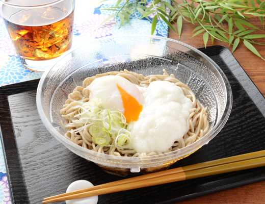 国産とろろに半熟玉子を合わせた冷しそば。つるみ、弾力のあるのど越しよい細麺を使用。つゆは宗田かつお節・さば枯節・椎茸・昆布などを使用し、塩味を抑えまろやかな味わいのつゆに仕上げた。※つゆは化学調味料不使用。
