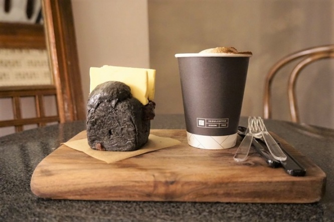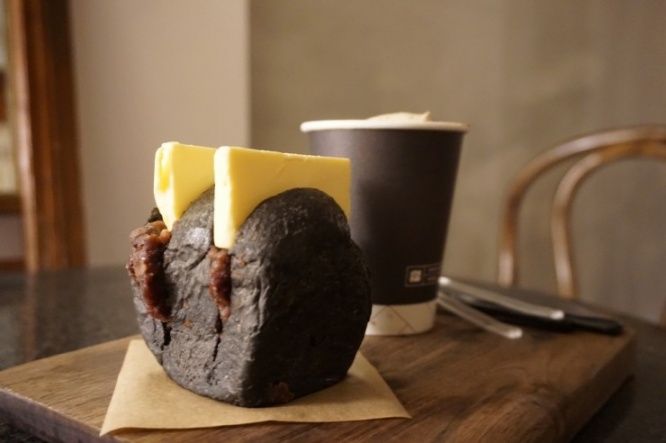筆者は、最も写真映えしそうな「あんバターイカ墨食パン」にトライ。イカ墨を練りこんだ真っ黒な食パンと、ウサギの耳のように飛び出たたっぷりのバターから目が離せません。