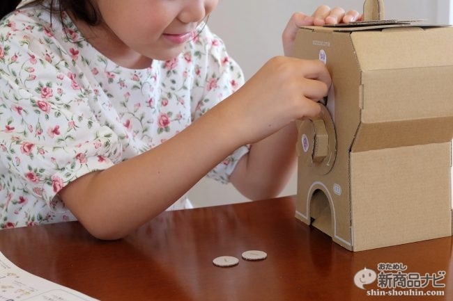 キャンディをセットして、コインを入れて、くるっと回すと、下のスライダーからキャンディが出てきた。娘は蓋の中を覗いて、キャンディが出てきた仕組みに興味深々。単純な仕組みなので説明も簡単で、親子で生み出した新しいおもちゃに、娘も記者も大満足だった。