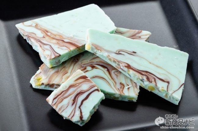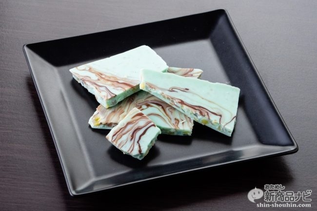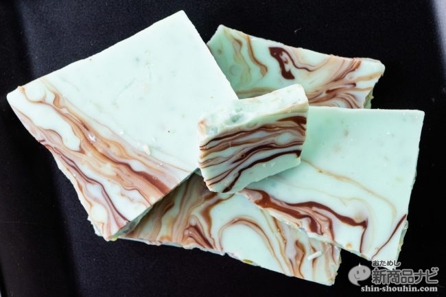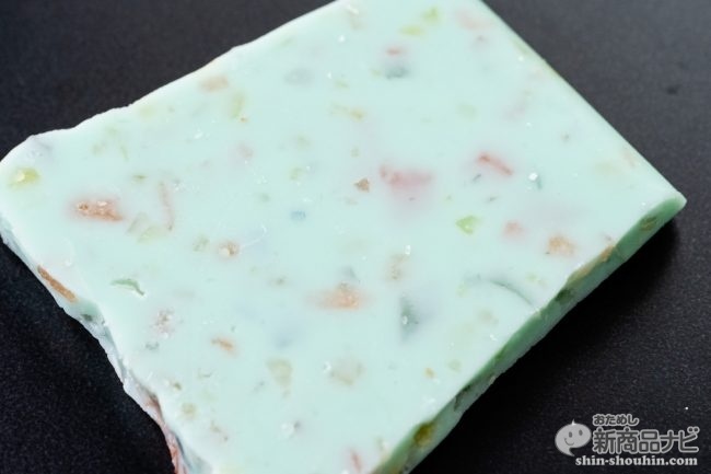 お皿に盛っただけでもおしゃれな感じにさっそくチョコレートをお皿に出してみると、チョコミントの良い香りとカラフルなマーブルチョコの見た目が楽しい。45gは少なめかと思いきや、パッケージから想像するより多く感じた。断面をよく見ると、カラフルなキャンディが練りこまれており、ただのミントチョコではないことが分かる。
