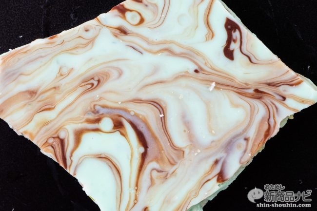 マーブルのない裏面を見てみると、たっぷりとキャンディが練りこまれているのが分かる。パチパチキャンディの存在を確認したところで、チョコレートを割ってひとかけら食べてみる。