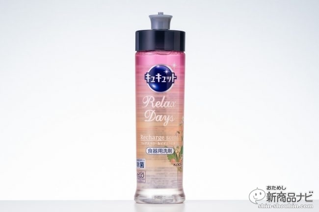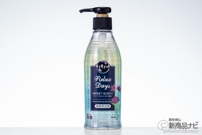 そんな中、目と鼻に対してアプローチすることで、面倒な洗いものタイムを少しでも楽しくしようとしてボトルデザインを一新、新フレーバーを追加したのが、花王『キュキュット ポンプ[デザインポンプ]オレンジの香り/同 クリア除菌/同 Relax Daysヴァーベナ&シトラスの香り』(300ml・実勢価格 税込324円・2019年7月13日発売)で、フレーバーに特化した標準形ボトルが『キュキュット Relax Days(リラックスデイズ)ヴァーベナ&シトラスの香り/ミックスベリー&ピオニーの香り』(240ml・実勢価格 170円・2019年7月13日発売)である。