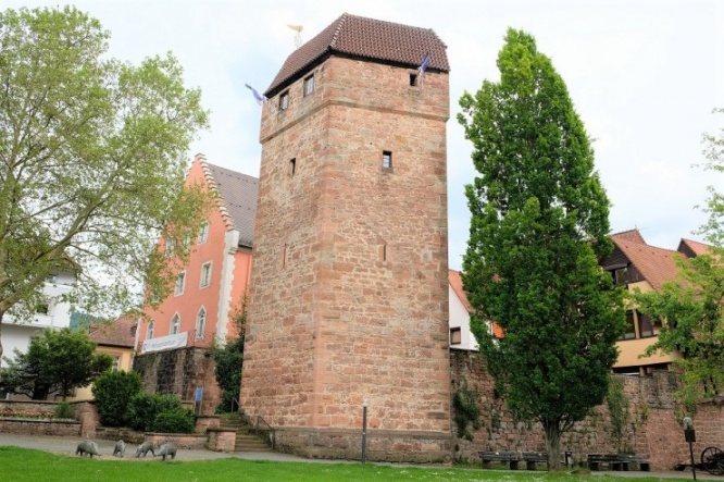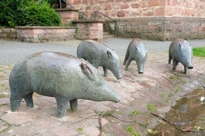 プルファー塔の足元には、4頭の可愛らしい仔イノシシたちの像があります。「イノシシの泉」と呼ばれていますが、水がほとんどなく泉には見えないのがちょっと悲しいところ。観光客のそう多くないエーベルバッハでは、イノシシ像は観光スポットというよりも、地元の子どもたちの格好の遊び場になっています。