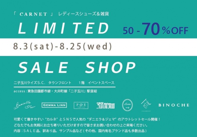 ・カルネ社 セール 期間:8月3日~25日 時間:10時~21時 場所:二子玉川ライズS.C. 1階 イベントスペース