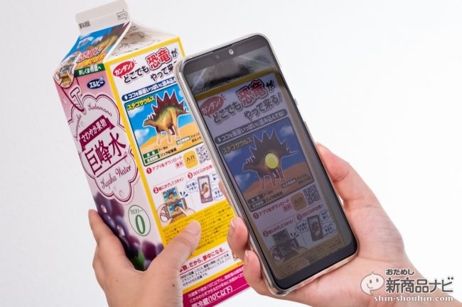 最初に試したのは『さわやか果物 巨峰水』のステゴサウルス。スキャンすると、画面にはリアルなステゴサウルスが出現! ゆっくりと画面の中をのしのし歩きまわる姿に大人でも思わず見入ってしまう。