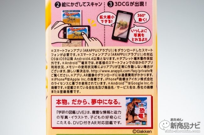 側面に方法が記載されている『さわやか果物 毎日の朝シリーズ 学研図鑑LIVE ARパッケージ』(2019年8月27日発売※期間限定)は、パッケージ側面にある写真を専用アプリからスキャンすると3DCGが出現する。