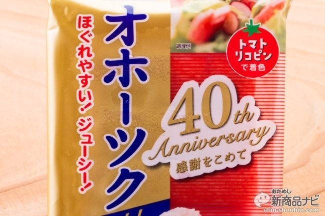 『オホーツク』(税抜価格263円・125g(1本約12.5g当たり10kcal)・2019年7月上旬より40周年記念パッケージにて発売中)は、ズワイガニをイメージした味とほぐれ感が特徴のスティックタイプのカニかまだ。ズワイガニのペーストを使用して、ふっくらジューシーに仕上げている。