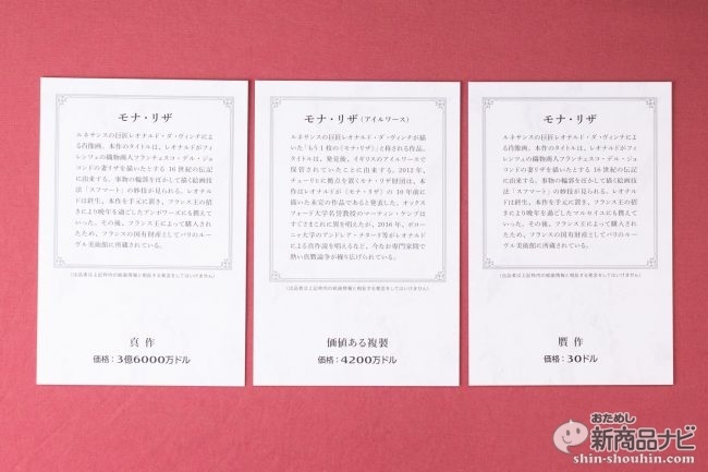 世界一有名な絵画といっても過言ではないレオナルド・ダ・ヴィンチ作『モナ・リザ』のカードを3枚並べてみる。見た目では中々違いが分からない…。
