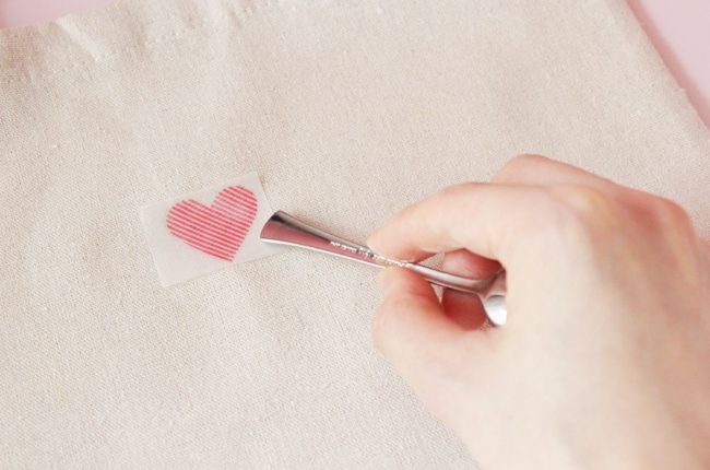 裏面の薄いフィルムをゆっくりと剥がしてシールを配置。透明の保護シートがズレないように指でおさえてから、しっかりと強くこすって転写する。柄が定着しているか確認しながら、保護シートを丁寧に剥がし、布を当てて上から指で強く押さえて、生地に馴染ませる。たったこれだけで完成!