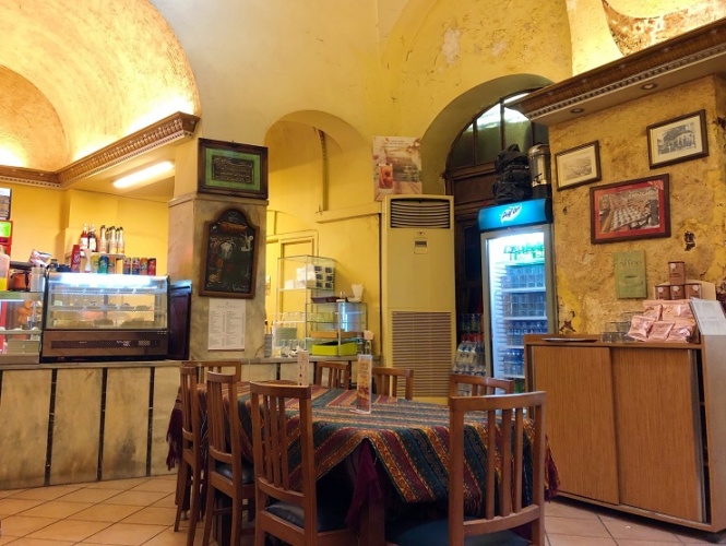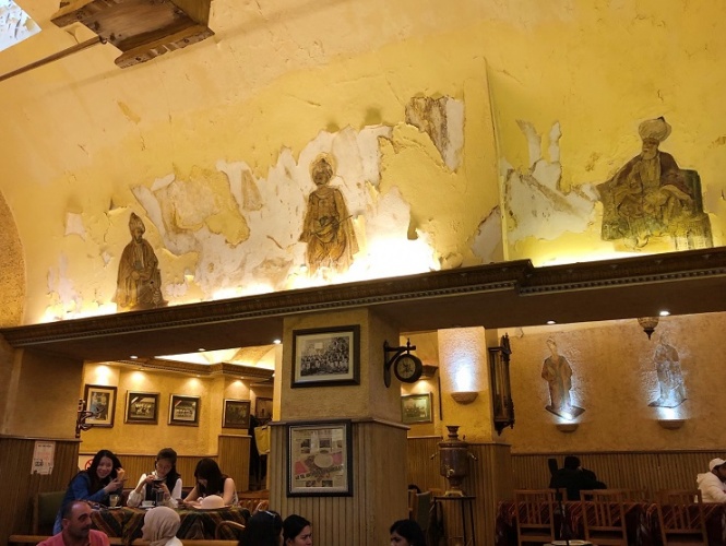 バザール内で喫煙が許されていた時代の名残で、壁に色づいたタバコのヤニの色がオレンジ色の照明に照らされ、はがれても手入れされないままの絵画が、なんとも絶妙な雰囲気を創り出しています。バザールの中にあるのに、天窓からの採光のおかげで、ほどよい開放感があります。
