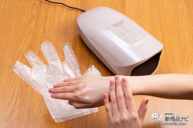 つづいては、ハンドクリームを塗った上で付属のビニール手袋をはめ、「Hot」ボタンで温めてさらに本格的なケアに挑戦してみることに。