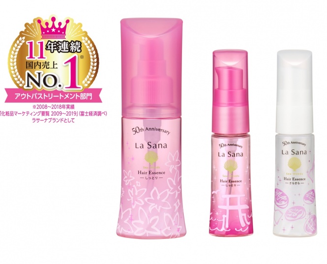 このデザインは、「ラサーナ 海藻 ヘア エッセンス しっとり」の75mlと25mlのサイズ、「ラサーナ 海藻 ヘア エッセンス さらさら」の25mlのサイズで展開される。