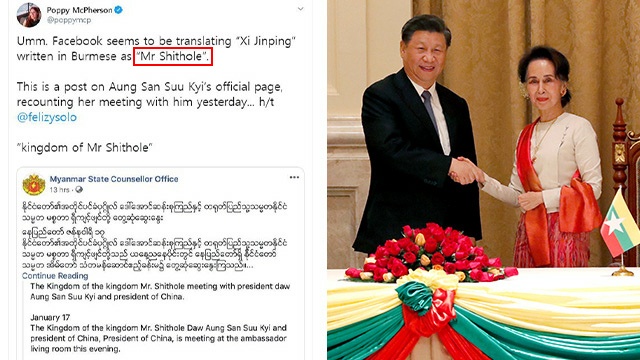 習主席のミャンマー訪問と首脳会談を知らせるビルマ語のFacebookの投稿で、習主席の名前は“非常に不潔な場所”を示す英語の比喩表現である「糞穴(Shithole)」と自動翻訳されてしまった。