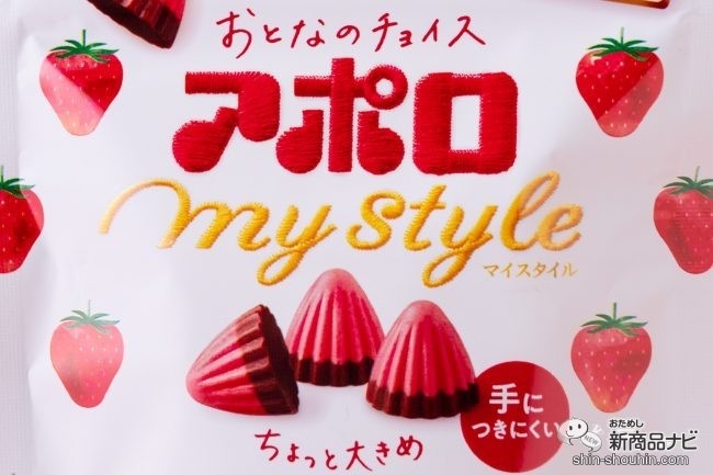 三角形の2層チョコレート「アポロ」発売50周年を記念して、大人のための『アポロマイスタイル』が新発売! 砂糖25%カット、濃厚な苺の風味が感じられる大人のアポロは味も見た目も食べやすさも大人のためにグレードアップ!