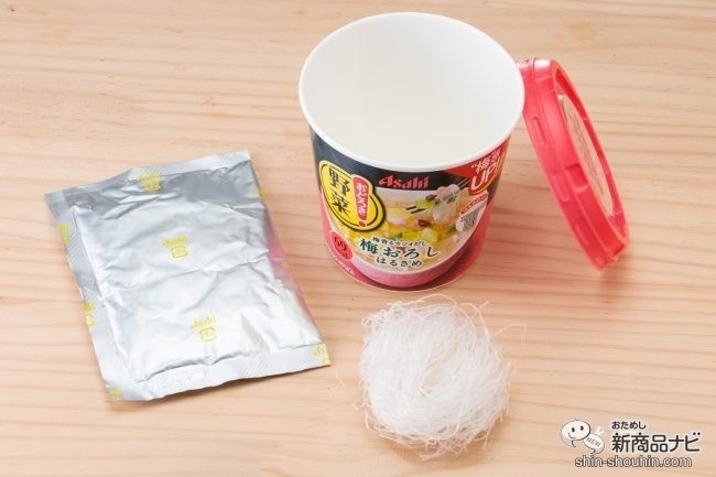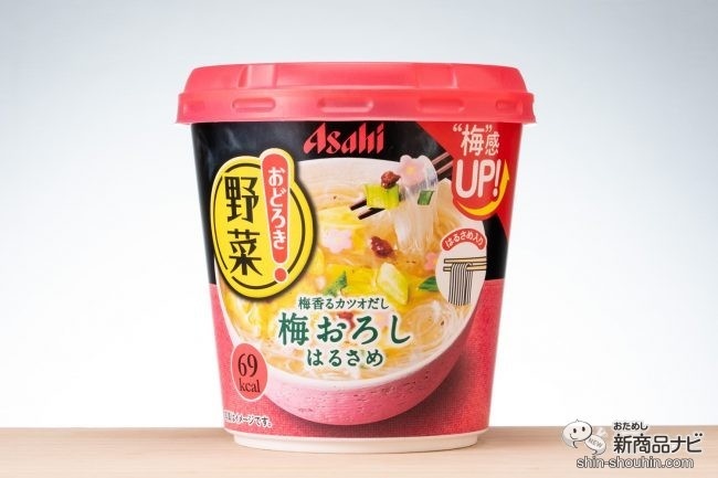 野菜たっぷり先ほどのが台湾風なら、お次は和風テイスト。ヘルシー食品を多く取り扱うアサヒグループ食品から登場した『おどろき野菜 梅おろし』(22.2g・実勢価格 税抜143円・2020年3月4日発売)は、リニューアルし“梅”感がアップしたスープ春雨。