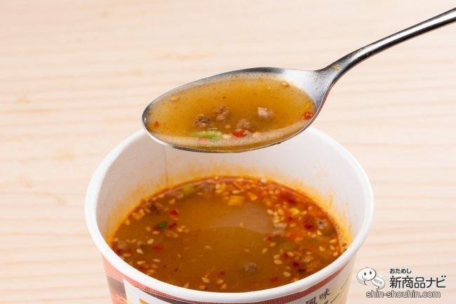 「野菜を食べるスープ」がコンセプトの「おどろき野菜」シリーズというだけあり、かやくはキャベツ、ネギ、かわいい花かまぼこ、味の主役となる赤い梅肉と具だくさん。もっちり食感の春雨と主役の梅と鰹のだしがよく利いていて、記者的には台湾風よりもあっさり食べられた。ちなみに、糖質15g、69kcalで、糖質・カロリーともに今回検証した中で一番ヘルシー。