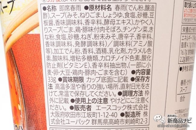 このペーストが味の決め手熱湯を入れ3分待ちフタを開けると、練りごまの香りが食欲をそそる。肉そぼろやチンゲン菜、ねぎ、唐辛子、ごまなど材料も豊富で食べごたえ抜群でありながら119kcalで、糖質は16.7gに抑えられている。
