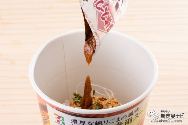 春雨の上にかやく入り粉末スープを入れ、熱湯を注いで待つこと3分。調味油を入れてかき混ぜると、乳白色のスープから黒酢や香ばしいごまの良い匂いが。
