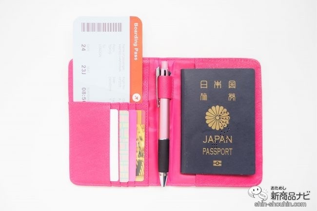 単行本ブックカバーくらいのスマートなサイズ感で、開くと中にはパスポート・ペン・チケットやカード類が収納できる。