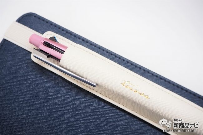 カバー外側にはバイカラーがオシャレなペンホルダー付き。内側にはカードポケットが付いているので、自分の名刺の予備を入れておくのにもとっても便利だ。