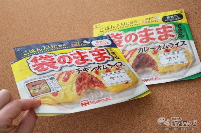 『袋のままできるチキンオムライス/カレーオムライス』(115g・希望小売価格 税抜270円・2020年2月20日発売)は、タマゴと牛乳があれば、後はレンジでチンするだけで、くるんとタマゴに包まれたオムライスが作れてしまうというもの。フライパンが不要で、パックされている袋を使うので、洗い物も少なくて済む。