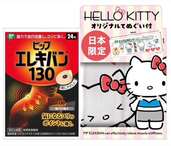 「ピップエレキバン130 Hello Kitty てぬぐい付セット」は、既存製品「ピップエレキバン130」に、Hello Kittyとピップエレキバンがデザインコラボした、日本限定のオリジナルてぬぐいが付いたセットです。