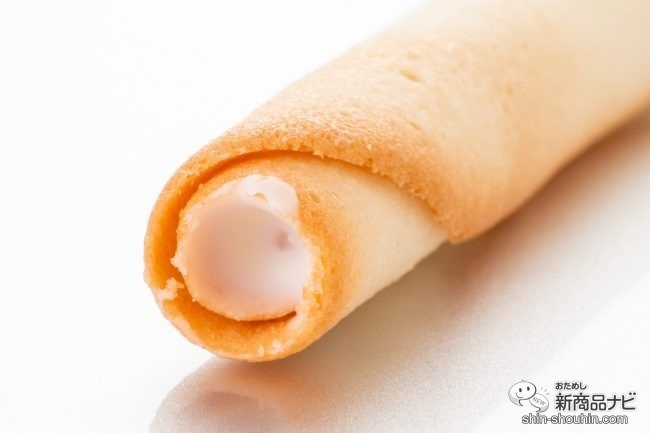 『ザク ロールラング・ド・シャ』(ホワイト/ミルク・1種×8本入・希望小売価格 各税込1,080円・2020年2月15日発売)は、ISHIYAが構想1年以上の月日をかけて開発したという待望の新商品。同社の看板商品である『サク ラング・ド・シャ』とは異なり、くるっと細く巻き上げたラング・ド・シャの中にチョコレートが流し込まれているのが特徴だ。