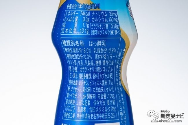 種類別:発酵乳 一本あたり74kcal、たんぱく質3g、脂質1.1g、炭水化物13.1、ナトリウム39mg、カルシウム100mg、ガラクトオリゴ糖0.18g公式サイト