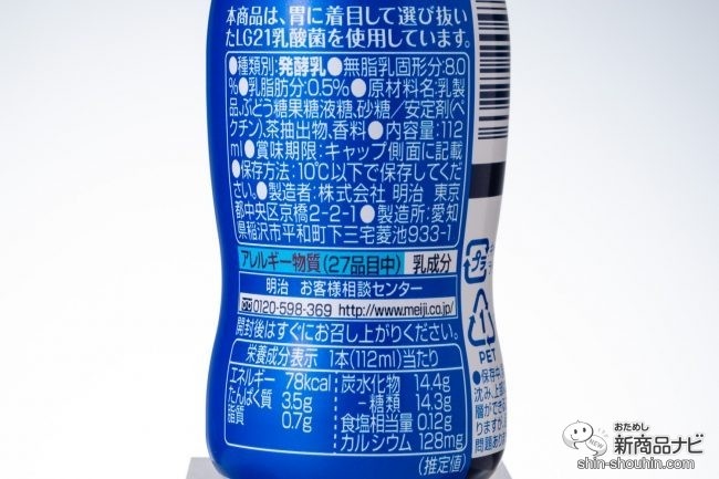 種類別:発酵乳 一本あたり78kcal、たんぱく質3.5g、脂質0.7g、炭水化物14.4g、糖類14.3g、食塩相当量 0.12g、カルシウム128mg公式サイト