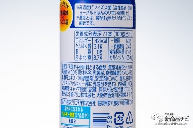 種類別:乳等を主要原料とする食品 一本あたりの栄養成分は、エネルギー 42kcal、たんぱく質 3.1g、脂質 0g、炭水化物 8.7g(糖質 6.3g、食物繊維 2.4g)、食塩相当量 0.14g、カルシウム 105mg公式サイト