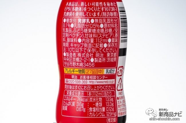 種類別:発酵乳 一本あたり37kcal、たんぱく質3g、脂質0.6g、飽和脂肪酸0.4g、炭水化物4.9g、糖質4.8g、食物繊維0.1g、食塩相当量0〜0.1g、カルシウム110mg公式サイト