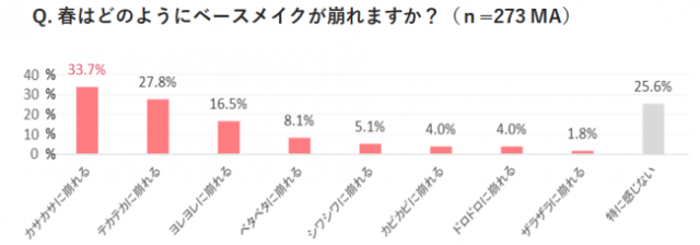 調査によれば、「春はどのようにベースメイクが崩れますか?」という質問に対し、最も多かった回答は「カサカサに崩れる」(33.7%)でした。