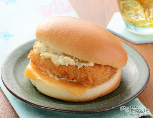 白身魚のフィッシュフライをチーズとタルタルソースと合わせてサンド。ゆで卵・炒め玉ねぎ・ピクルス入りのタルタルソースたっぷりで、ジューシーに食べられる仕立て。
