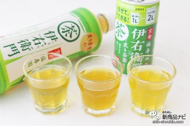 左から、ペットボトル、1L希釈、2L希釈1番濃い色をしているのが、濃縮タイプを1L分で作ったもの。緑茶の深い渋みが感じられて、後味はスッキリ。「炙り茶葉仕立て」とあるように、濃い緑茶の味わいが楽しめて食事にもぴったりの味わいだ。甘く香ばしい香りもしっかりと感じられる。