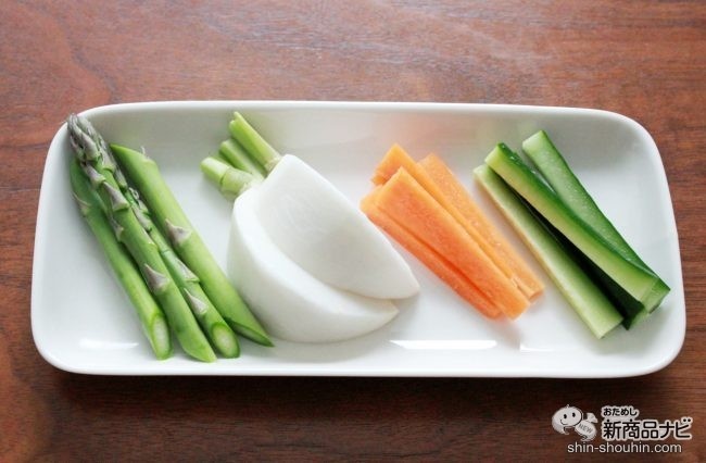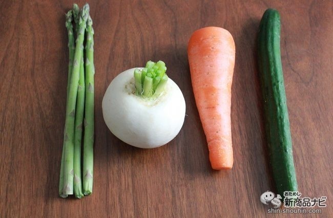 旬のアスパラ、カブ、定番でキュウリやニンジンを用意した。