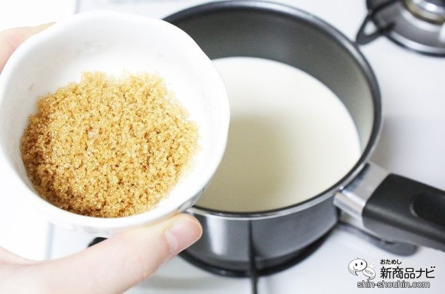 豆乳にきび砂糖を加えて、温めながら溶かしていく。豆乳は調整豆乳を使用。