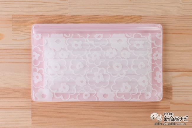 プラスチック「ポリオレフィン0.2+0.2+0.2(抗菌対応)」素材は、手に取るとくたっとしていて柔らかい。滑らかな手触りで、水に濡れても拭き取れる。厚みや幅を取らず、気軽に持ち運びが可能だ。チャック付きで微塵を防ぎ、マスクに限らず薬などの持ち運びにも便利な仕様になっている。