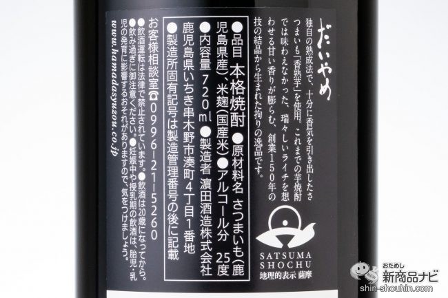 そんな思いが込められた『だいやめ~DAIYAME~』の最大の特徴は香り。独自の技術で熟成された「香熟芋(こうじゅくいも)」から作られており、芋焼酎ながらもライチのような華やかな香りを楽しめる。