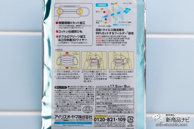 フィットさせる付け方が裏面に記載されている確かに、ワイヤーをしっかり鼻に合わせて形を作れば、輪郭にピタッと密着する。口呼吸でも空気が漏れにくく、眼鏡をかけても曇りにくい。