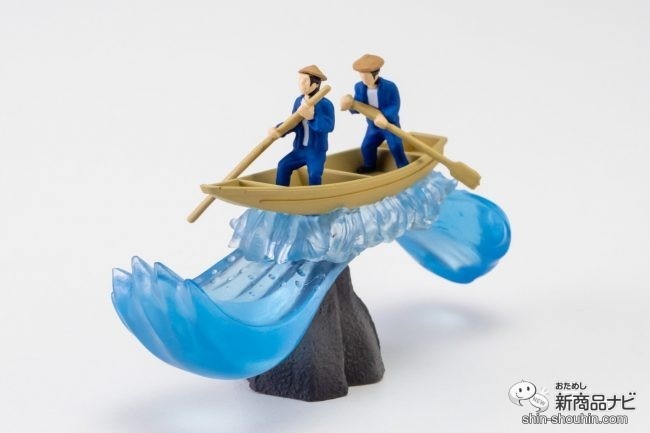 保津川の船下りの臨場感を大きな波とともに表現。 付属の岩石に船を乗せ、指で軽く触れるとゆらゆらと動く。