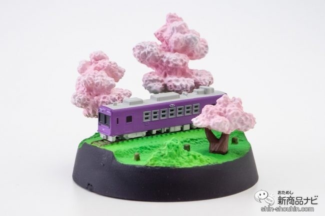 サイズは直径約4.8㎝、高さ約4㎝、前面窓は大型の2枚窓、行先案内版には嵐山やRAIDENの文字、桜色と新緑が箱庭のように心を癒やしてくれそう。