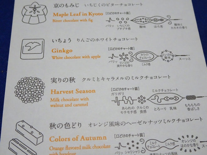 味わいの変化がわかる「口どけのチャート図」が付いているのも特徴。一つ一つの可愛らしいチョコレートを愛でつつ、名前を知りチャート図で味わいの変化を学ぶ……