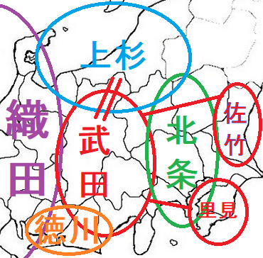 勝頼の外交図。後に里見氏とも同盟し、遠交近攻を実践するも、若干の力不足は否めない。