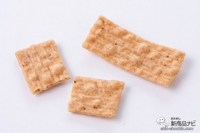 亀田製菓の製造技術を用いて焙煎玄米粉が練り込まれた生地は、薄く延びた食べやすい長方形サイズ。このサイズ感も女性がひと口で食べやすい大きさを意識してつくられたという。